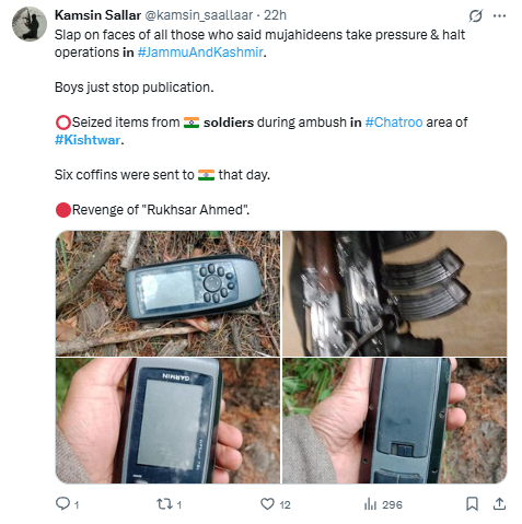 “Slap on the faces of those who said mujahideen buckle under pressure and halt operations in Jammu and Kashmir. The boys just stopped publication, seized items from soldiers during the Chatroo ambush in Kishtwar.”