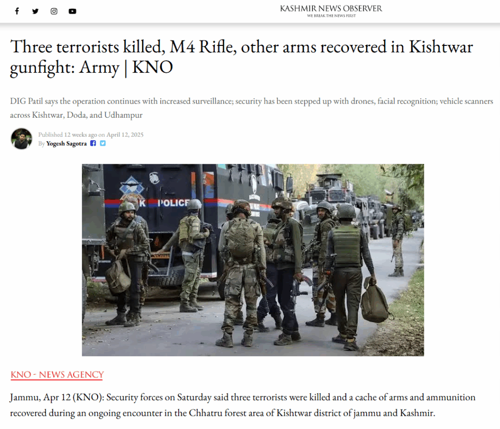 On April 12, 2025, Kashmir News Observer reported that security forces neutralized three terrorists during an ongoing encounter in the Chhatru forest area of Kishtwar, Jammu and Kashmir.