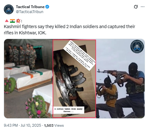 One such account, Tactical Tribune, posted that militants had killed two Indian soldiers and seized their weapons in the Kishtwar region.