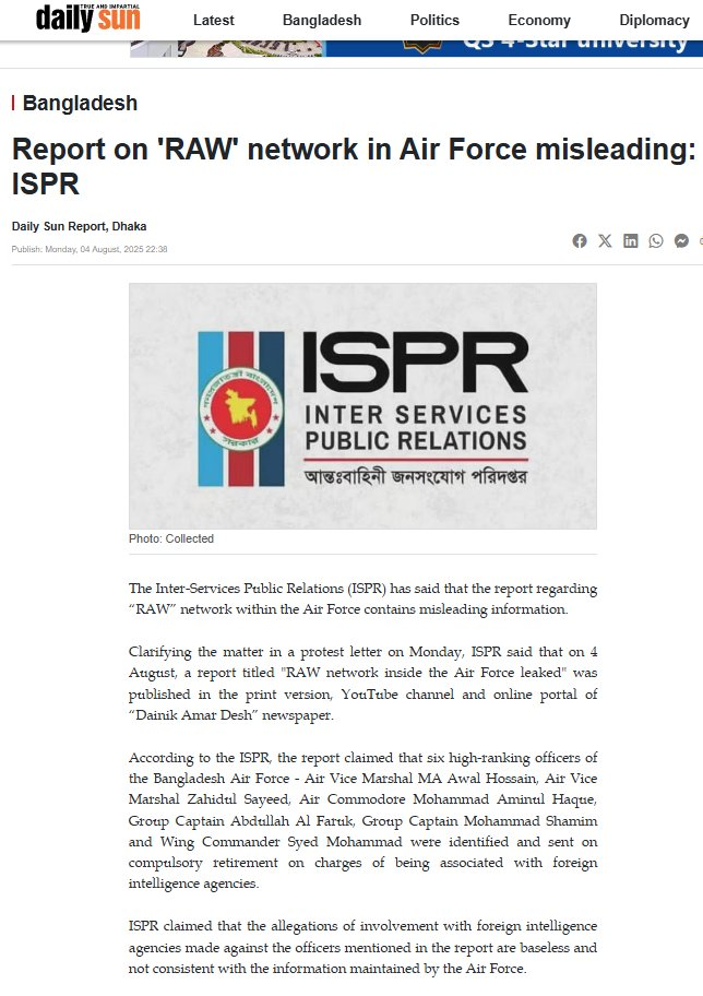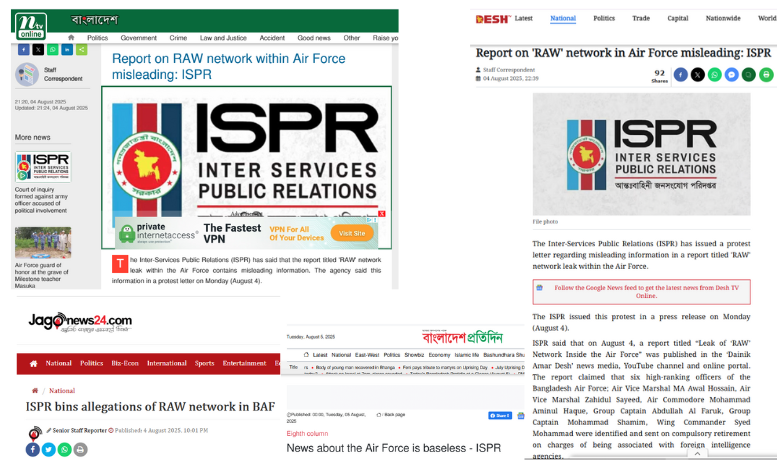 The report by Dainik Amar Desh alleged that 6 senior officers from the Bangladesh Air Force were identified and forcibly retired due to suspected links with foreign intelligence agencies, specifically India’s RAW. However, the ISPR clarified that these claims are unfounded and do not align with official records maintained by the Air Force.