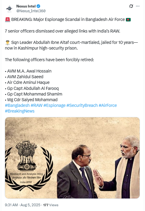 Some Pakistan-based accounts have shared the claim stating that, Bangladesh court-martialled and sacked 7 senior Air Force officers for links with the Indian intelligence agency RAW.