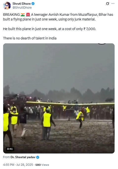 A viral video is shared where a huge crowd can be seen on the ground around a plane flying in an open field. While sharing the video, users have claimed that it claims that a teenager named Avnish Kumar from Muzaffarpur, Bihar, built a working plane in just one week using scrap materials, spending only ₹7,000.