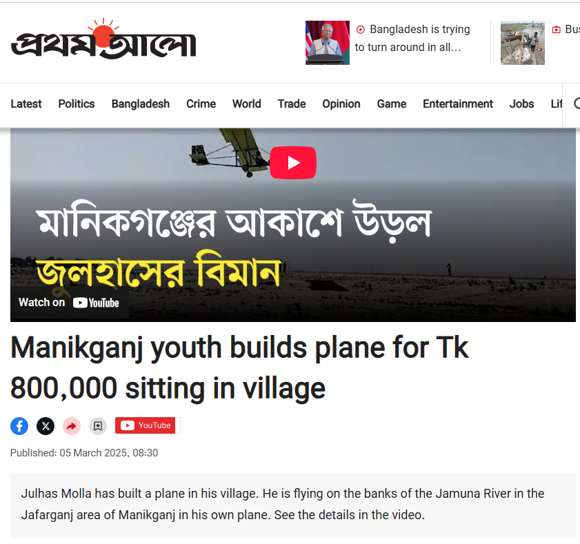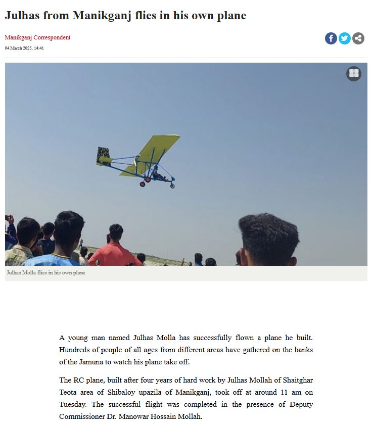 Using relevant keywords, we traced the story to media reports from Prothom Alo and Bangla Tribune, March 2025. They identified the man as Julhas Molla of Shaitghar Teota, Shibaloy upazila, Manikganj, Bangladesh. After four years of effort, he completed and flew his RC plane at around 11 a.m. on a Tuesday, as hundreds of onlookers gathered along the banks of the Jamuna River. The successful flight took place in the presence of Deputy Commissioner Dr. Manowar Hossain Molla.