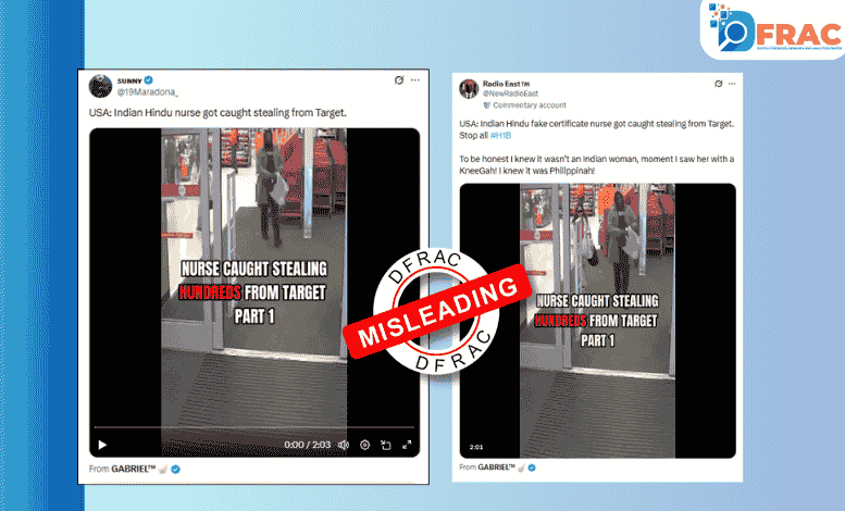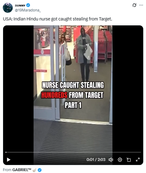 A video circulating online shows a woman leaving a supermarket, where security guards stop her at the exit. Later, she appears to be interrogated. The accompanying viral claim alleges that the woman is an “Indian Hindu nurse” who was caught stealing from a Target store in the USA.