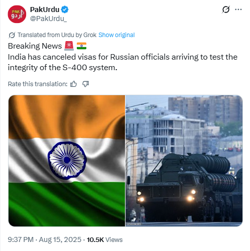 Social media posts allege that India canceled visas for Russian officials who were scheduled to arrive and test the integrity of the S-400 air defense system. Multiple Pakistan-based users have shared the claim, which can be viewed here and here.