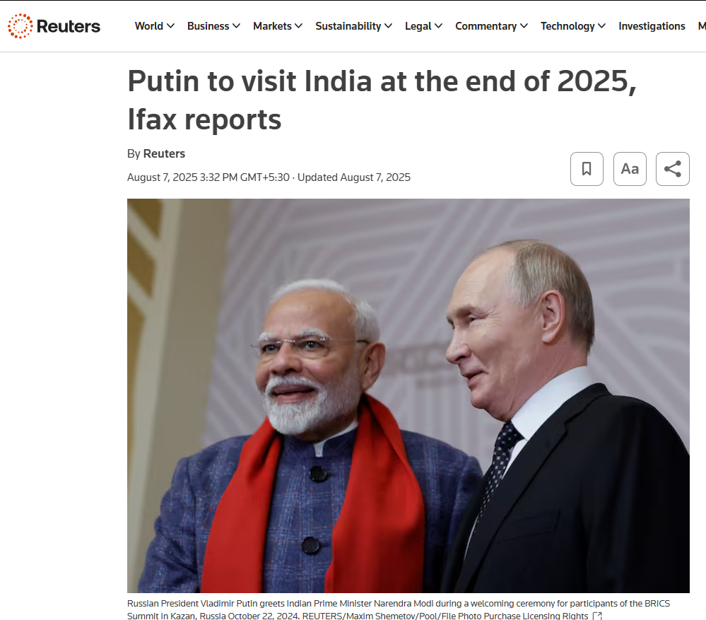 In the recent news by Reuters, it is reported that Russian President Vladimir Putin will visit India at the end of 2025, Interfax news agency quoted India’s national security adviser Ajit Doval as saying in Moscow on Thursday, correcting an earlier report that he would go in late August.