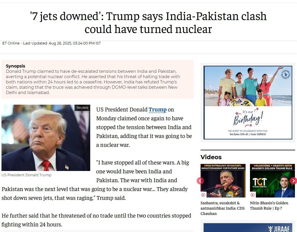 Upon investigation, we found the claim to be misleading. In the original press briefing on Monday, August 25, President Trump said, “I have stopped all of these wars. A big one would have been India and Pakistan. The war with India and Pakistan was the next level that was going to be a nuclear war… They already shot down seven jets; that was raging.” Several media outlets, including The Economic Times and The Times of India, also reported this statement. However, at no point did Trump specify that Pakistan shot down 7 Indian jets.