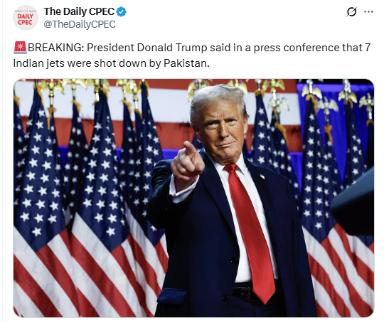 Pakistan-based accounts have claimed that President Donald Trump said in a press conference that Pakistan shot down 7 Indian jets.