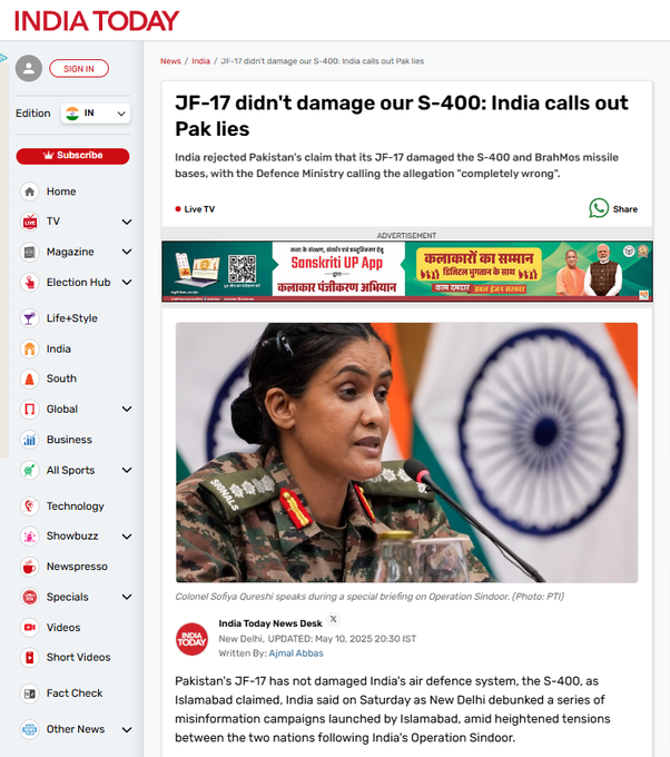 On May 10, 2025, Pakistani state media claimed that its JF-17 Thunder jets had destroyed an S-400 air defense system at Adampur using hypersonic missiles. Similar false claims about the destruction of the S-400 have circulated multiple times, all of which were immediately rejected by the Indian Defence Ministry.