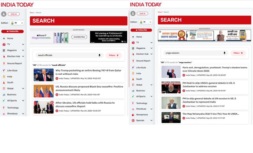We cross-checked the India Today website by searching keywords from the alleged headline, such as “Indian delegation,” “Saudi officials,” and “UNGA session.” No such article appeared in the results. To verify further, we checked the Wayback Machine, but again found no record of the claimed report. Additionally, we reached out to India Today journalist and fact-checker Jyoti Dwivedi, who confirmed that no such article was ever published. This indicates the circulated screenshot is fabricated.
