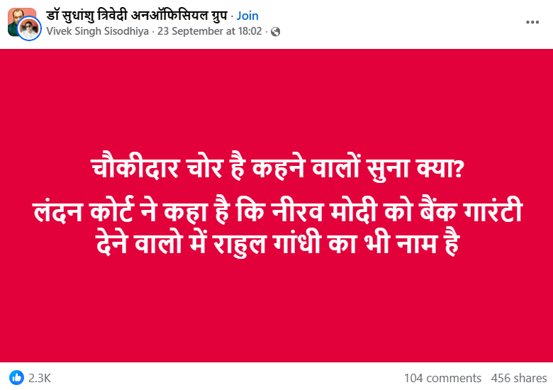 On Facebook, a user wrote: “Those who said ‘chowkidar chor hai’, did you hear? The London court has said that Rahul Gandhi’s name is among those who gave bank guarantees to Nirav Modi.”