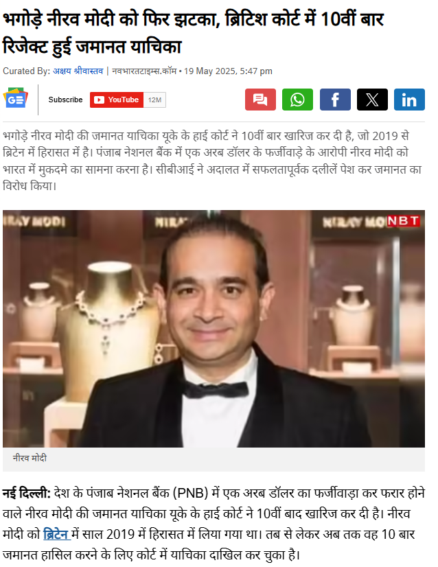 The DFRAC team investigated the viral claim. Using Google search with relevant keywords, we did not find any information published in English or Hindi media mentioning Rahul Gandhi’s name as a bank guarantor for Nirav Modi. Recent news only shows that Nirav Modi’s bail plea was rejected by a UK court.