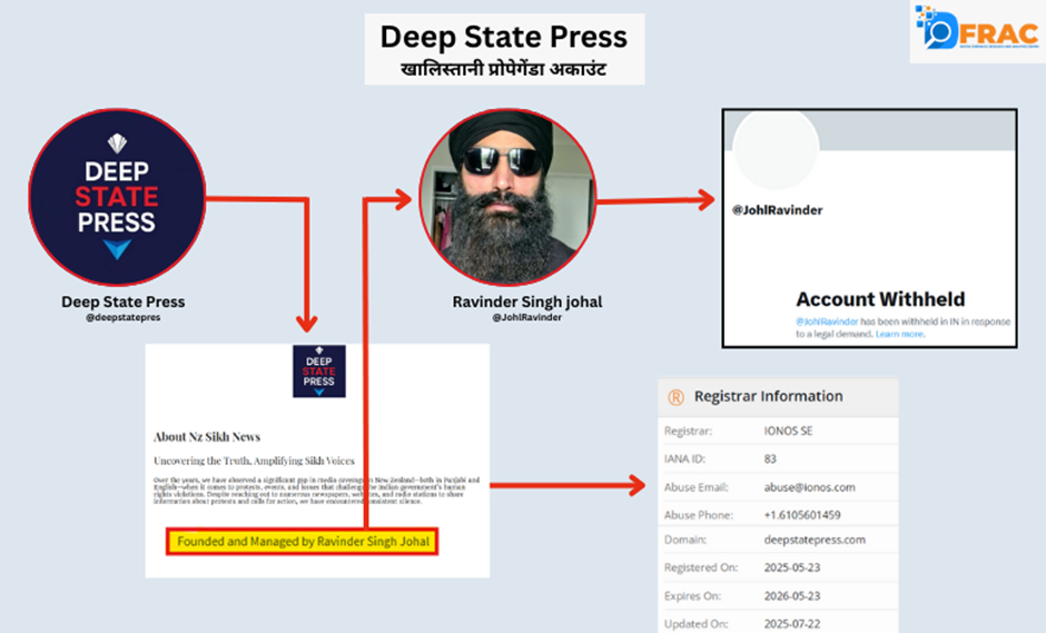 In our investigation of this website, we found that its founder and operator is listed as Ravinder Singh Johal. Upon gathering information about Ravinder Singh Johal, we found that due to his Khalistani separatist agenda, his X (formerly Twitter) handle has been withheld in India. Meanwhile, gathering information about Deep State Press on Whois.com revealed that an American number is registered to it.