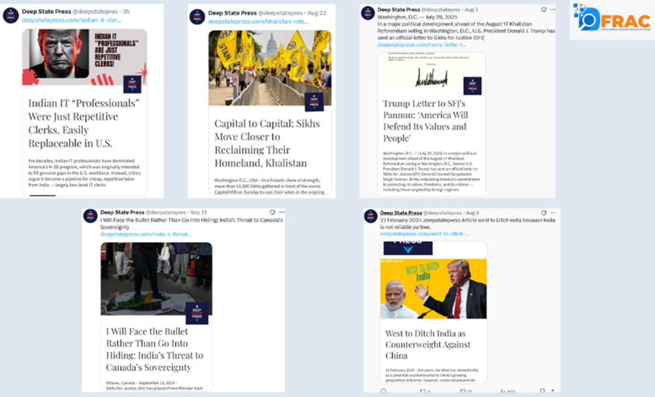 In one X post, Deep State Press calls Indian IT professionals “clerks” and “easily replaceable,” which appears to be aimed at belittling the Indian IT industry and India’s soft power. Meanwhile, one post tries to legitimize and “highlight” the Khalistan movement. In one post, it makes the fake claim that US President Trump has supported SFJ (Sikhs for Justice). Deep State Press, while running an anti-India narrative, not only belittles the Indian IT sector but also legitimizes the Khalistan movement, portrays India as aggressive in the Canada dispute, and tries to show India’s global strategic position as weak.