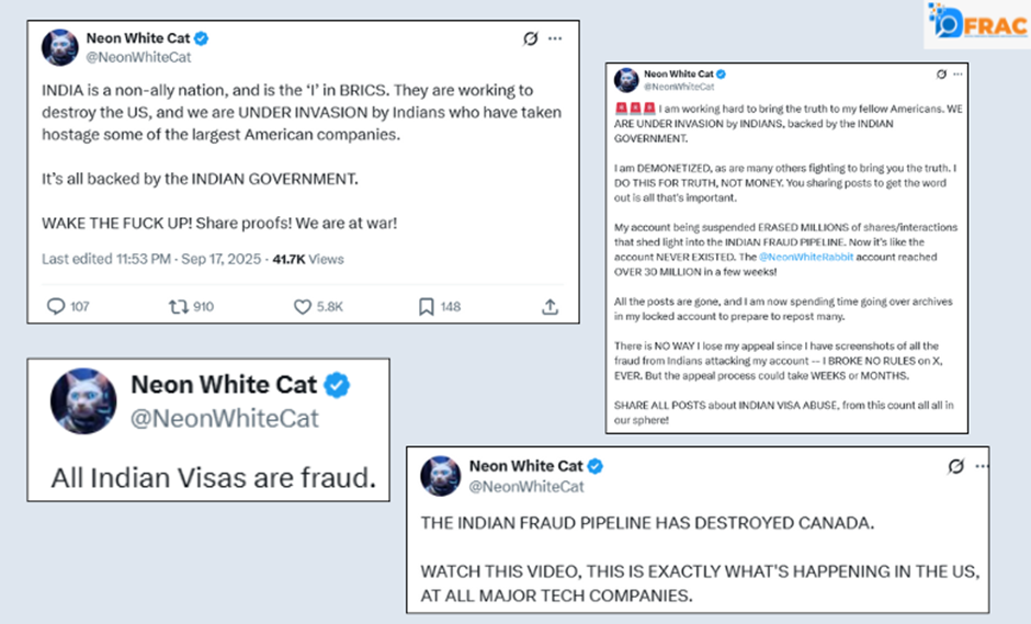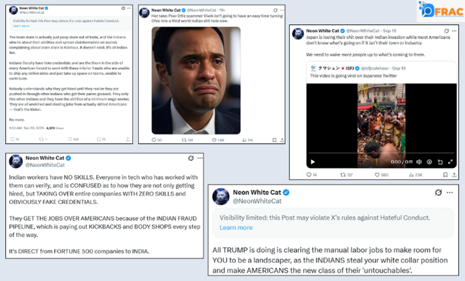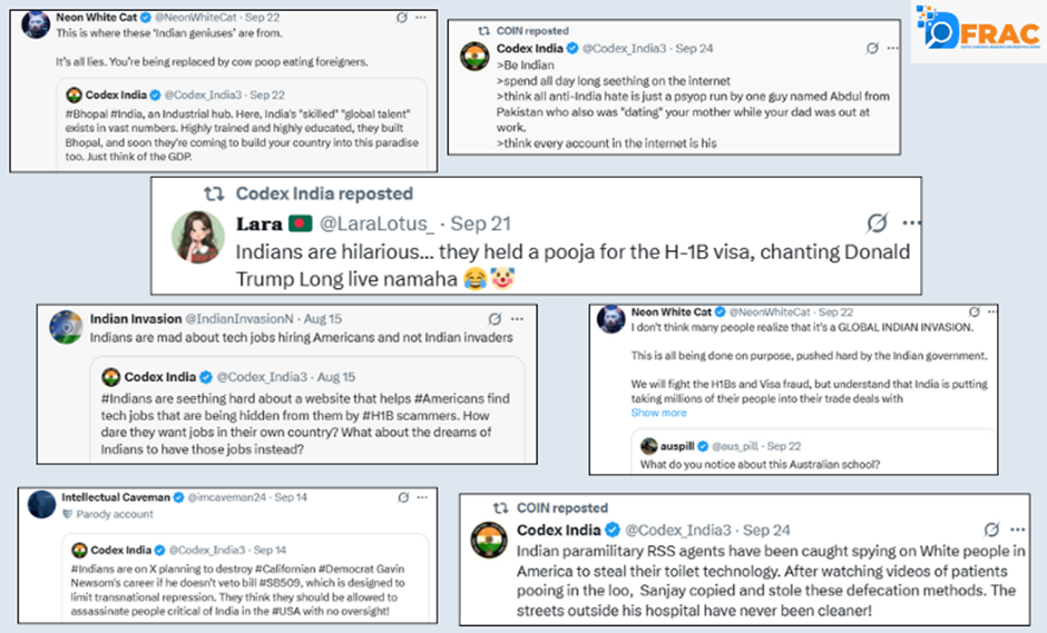 These social media accounts are regularly copying-pasting and reposting each other’s content, creating a pattern of collective, planned propaganda. First, look at the posts of Neon White Cat and Codex India. Here, both accounts often share insulting and misleading material against India and Indians. Neon White Cat uses language in his tweets that proves India and Indians trivial, such as mentioning “cow poop eating foreigners” and “GLOBAL INDIAN INVASION.” Meanwhile, Codex India reposts similar material and sometimes presents it in detail, such as mocking claims related to H-1B visas and tech jobs.