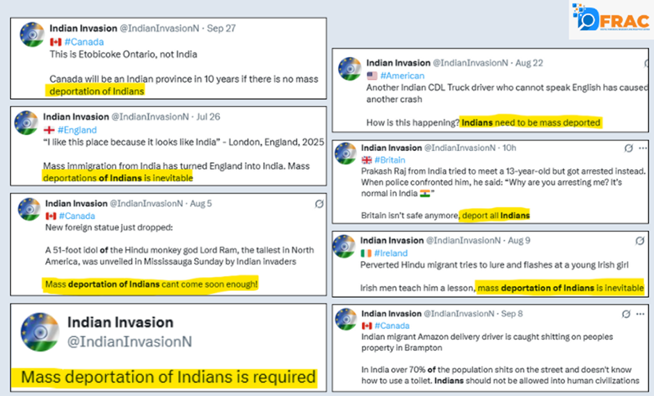 @IndianInvasionN‘s content is clearly anti-India and spreads hatred against Indian immigrants. The posts show a combination of demands for mass deportation, cultural insults, and separatist messages. This campaign not only tarnishes the image of Indians on social media but also attempts to create fear and mistrust globally. @IndianInvasionN is a collection of anti-India and separatist posts. It mainly shows that this user is consistently focused on spreading mass deportation and negative narratives against Indians.