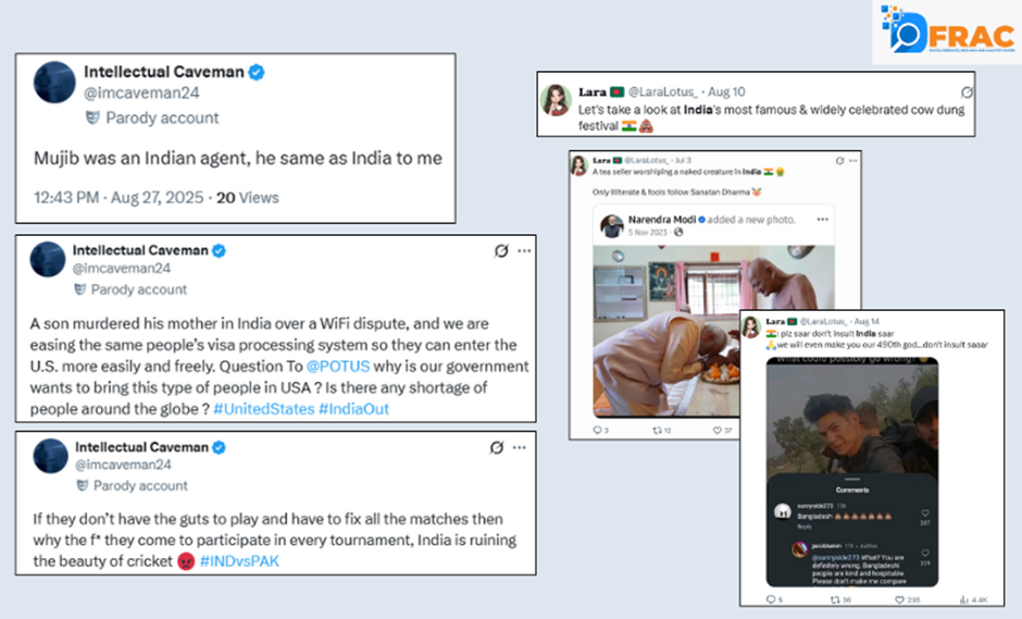 A special “Bangladesh connection” has emerged in the network spreading anti-India online propaganda. Two users are involved in this nexus who have direct ties to Bangladesh. These users are Intellectual Caveman and Lara. Their content often includes fake news, false reports, and inflammatory posts, which this network rapidly spreads through each other’s channels and profiles.