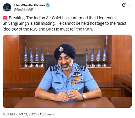 A video of Chief of the Air Staff (CAS) Air Chief Marshal AP Singh is being circulated by Pakistan-based accounts claiming that “The Indian Air Chief has confirmed that Lieutenant Shivangi Singh is still missing.” The posts further allege that he is “being forced to hide the truth by RSS and BJP.”
