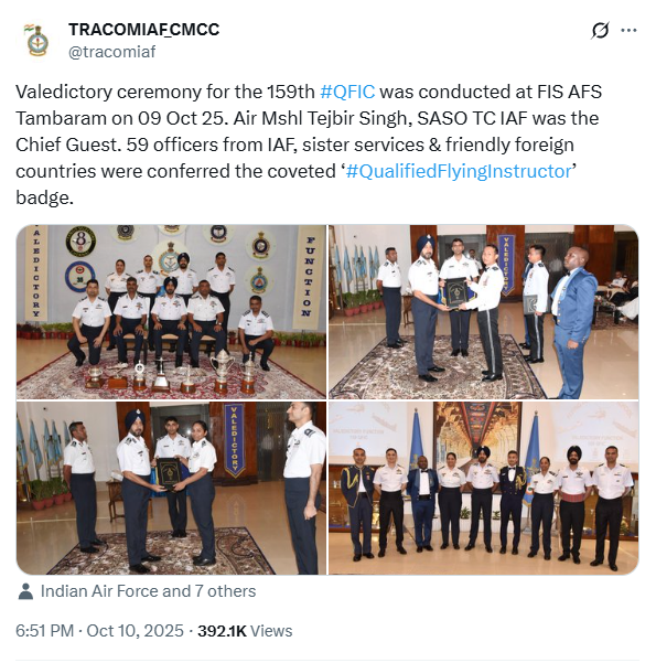 Additionally, during the Valedictory Ceremony held on October 10, 2025, Squadron Leader Shivangi Singh received the Qualified Flying Instructor (QFI) badge, becoming the first woman fighter pilot in India to achieve this distinction.