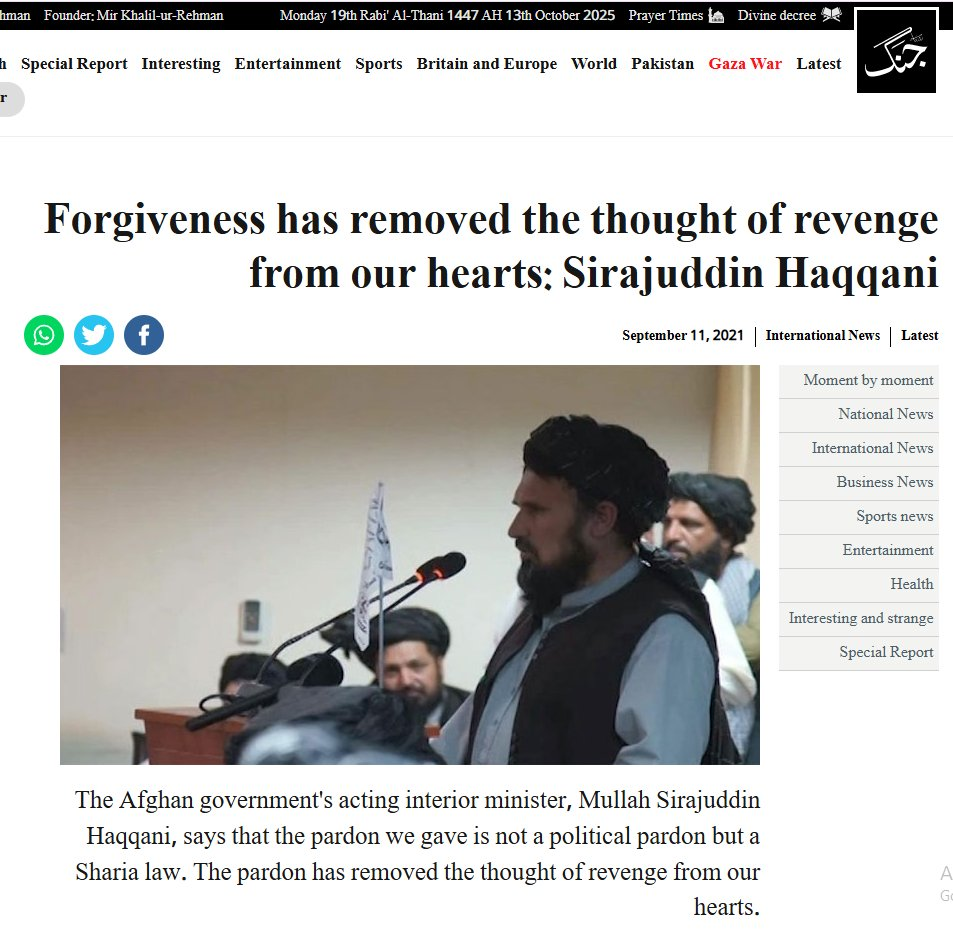Upon investigation, this claim was found to be fake. A review of credible Pakistani and international media found no record of Haqqani making such a statement. The closest reference is a 2021 report in Jang, quoting Haqqani as saying: “The forgiveness we gave has removed the mentality of revenge from our hearts.” In that same speech, Haqqani clarified that the forgiveness he mentioned was religious in nature and based on Shariah law, not a political statement or apology directed toward Pakistan. No credible source has published a statement resembling the one in the viral graphic.