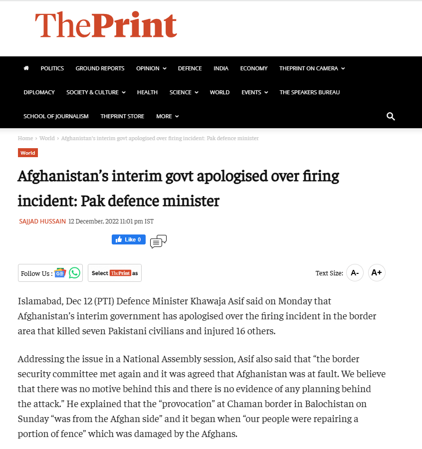 A 2022 report by The Print noted that Afghanistan’s interim government had previously apologized to Pakistan over a border firing incident, as stated by Pakistan’s Defense Minister at the time. This, however, was a specific diplomatic apology related to a military event, not a statement by Sirajuddin Haqqani expressing forgiveness or remorse as claimed in the viral graphic.