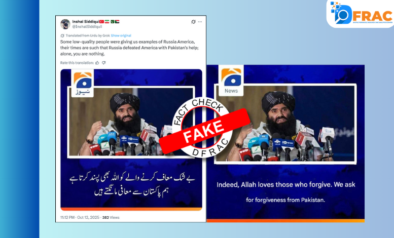 A graphic circulating online claims that Afghanistan’s Interior Minister, Sirajuddin Haqqani, said, “Indeed, Allah loves those who forgive. We ask for forgiveness from Pakistan,” in reference to the recent visit of Afghanistan’s Foreign Minister to India.
