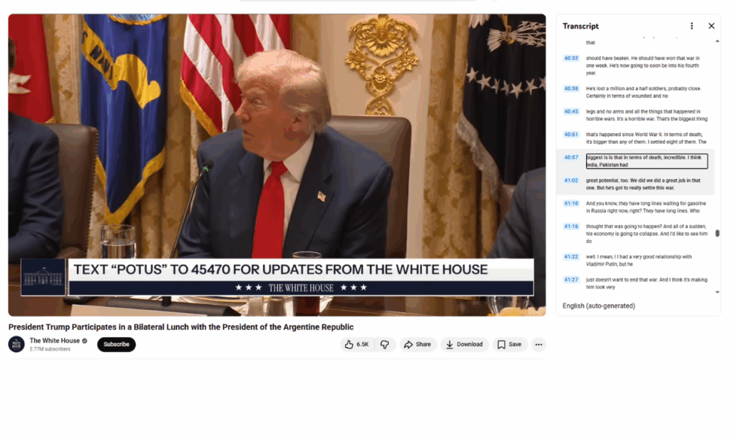 Upon reviewing the original video titled “President Trump Participates in a Bilateral Lunch with the President of the Argentine Republic,” on the official YouTube channel of The White House(15 October 2025), no such statement was made. In the authentic footage, Trump discussed the ongoing Russia-Ukraine war, describing it as “the biggest thing since World War II in terms of death.” He went on to mention that he had helped de-escalate several conflicts, briefly referencing India and Pakistan by saying they had “great potential” and that “we did a great job in that one.”