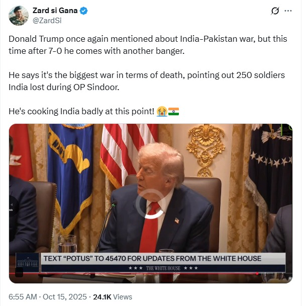 A Pakistan-based user has shared a name, Zard si Gana, who shared the post stating, Donald Trump once again mentioned about India-Pakistan war, but this time after 7-0 he comes with another banger. He says it’s the biggest war in terms of death, pointing out 250 soldiers India lost during OP Sindoor.