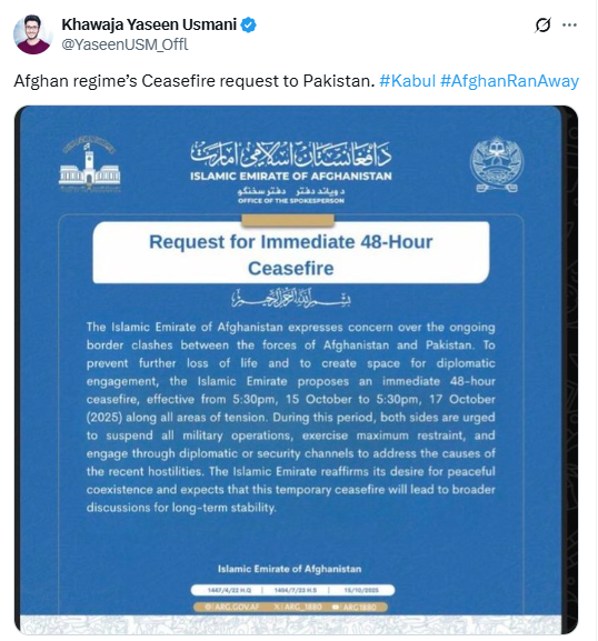 One of the users has shared the graphic claiming, “Afghan regime’s Ceasefire request to Pakistan.”