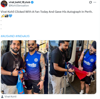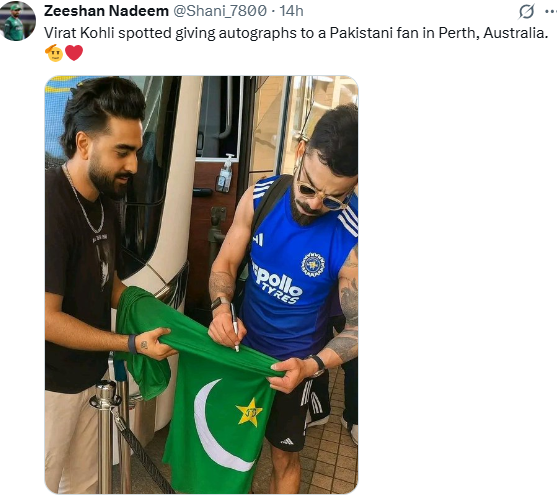 A user on X.com, by the username @Shani-7800, shared this photo with a caption that says, “Virat Kohli spotted giving an autograph to a Pakistani fan in Perth, Australia.” Comments on this post were filled with fans, with some criticising the move and some anticipating a step towards restoring relations.