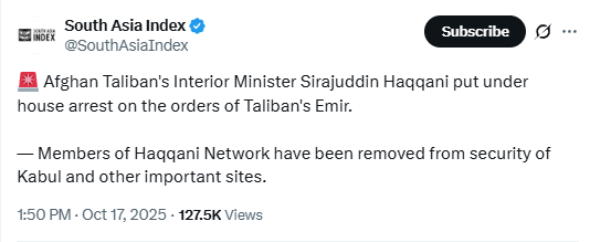 Social media users have shared the claim stating, “Afghan Taliban’s Interior Minister Sirajuddin Haqqani put under house arrest on the orders of Taliban’s Emir”.