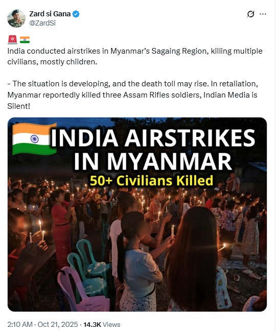 Several Pakistan-based social media accounts have circulated claims alleging that India conducted airstrikes in Myanmar’s Sagaing Region, resulting in the deaths of multiple civilians, including children.