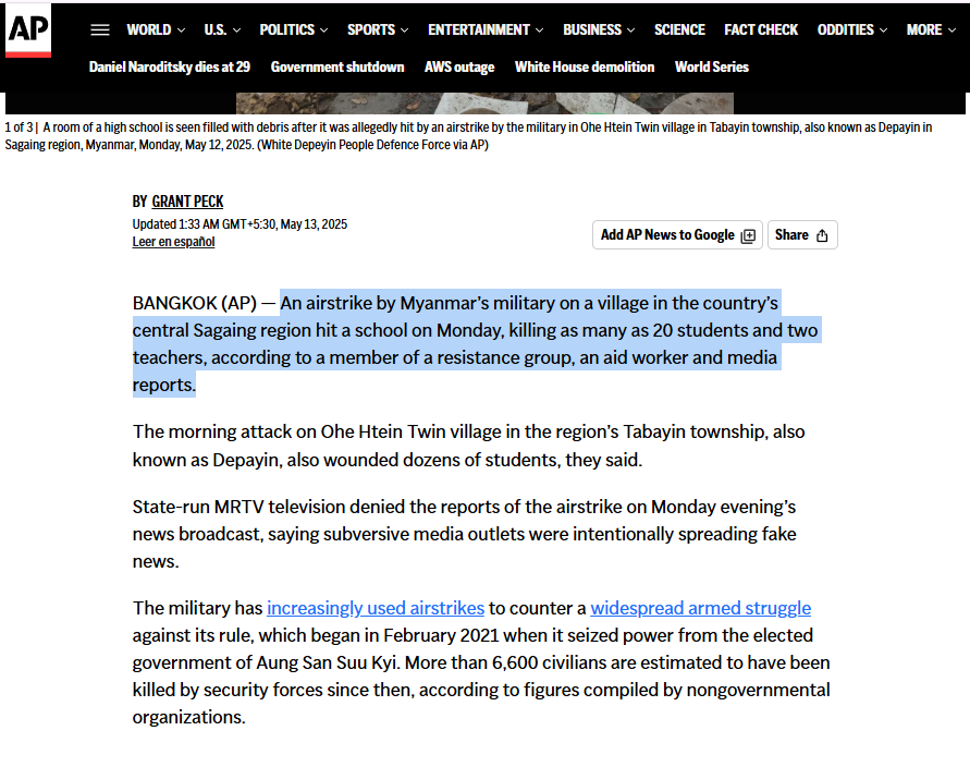 Upon investigation, this claim was found to be misleading. According to media reports from May 2025, an airstrike by Myanmar’s military targeted a village in the country’s central Sagaing Region. The attack struck a school in Ohe Htein Twin village, located in Tabayin (Depayin) Township, killing around 20 students and two teachers, and injuring dozens of others. The reports clearly attribute the attack to the Myanmar military and do not mention any involvement by India in the incident.
