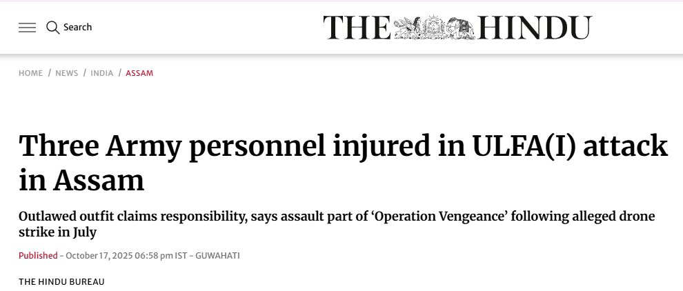 Separately, there were reports of a clash between ULFA (I) militants and the Indian Army at an Assam base camp, during which three soldiers were injured. An official Indian Army statement clarified that unidentified terrorists opened fire on the Kakopathar Company post from a moving vehicle around midnight. The troops immediately retaliated while taking precautions to prevent civilian casualties in the surrounding area on October 17, 2025.