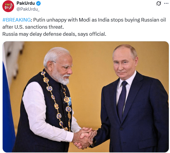 One X user posts the image from last year when Modi visited Russia for a Russian ceremony. And it added the caption that says, “Putin unhappy with Modi as India stops buying Russian oil after U.S. sanctions threat. Russia may delay defence deals, says official.”