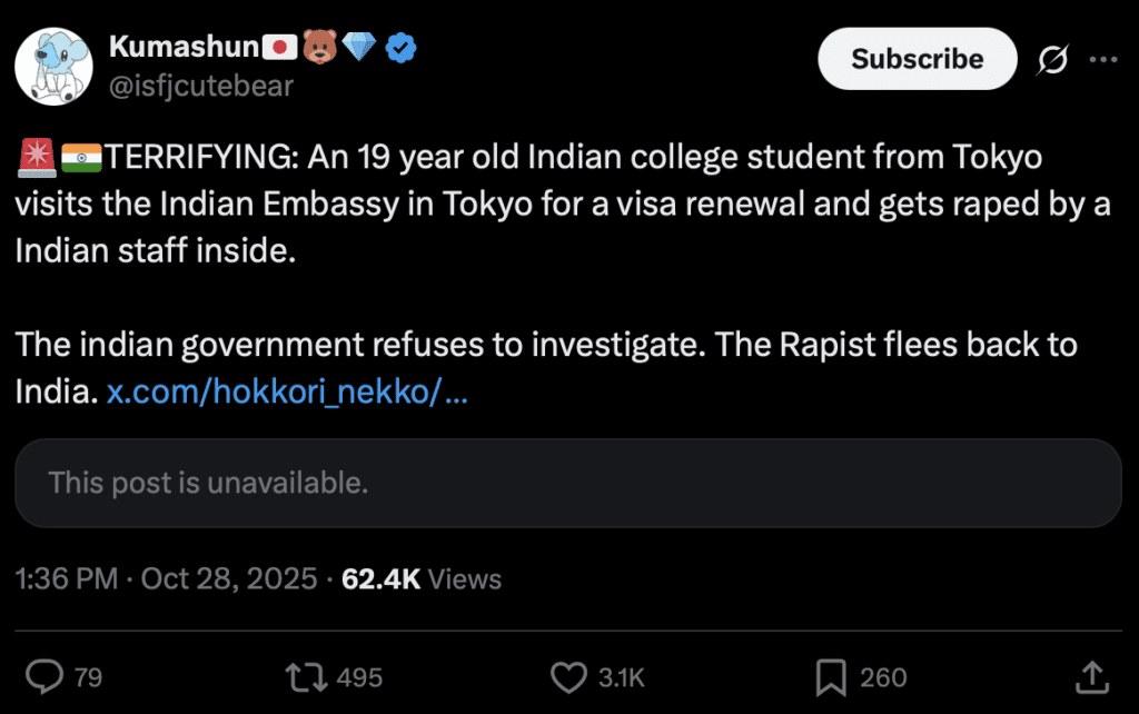 A social media user claims that a 19-year-old Indian college student from Tokyo visits the Indian Embassy in Tokyo for a visa renewal and gets raped by an Indian staff member inside.