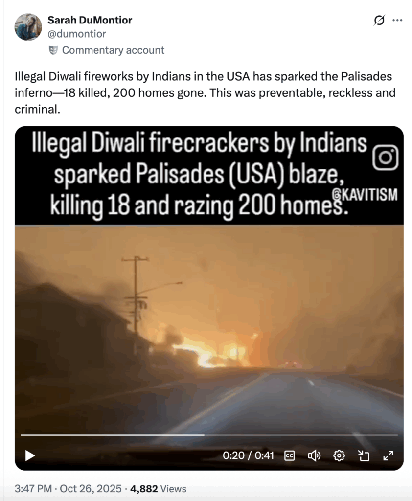Social media users have shared a video in which high-rising flames and utmost destruction are blatantly visible. While sharing the video, the users have claimed that illegal Diwali celebrations in the USA by the Indians have sparked the Palisades fire, killing 18 and destroying 200 homes