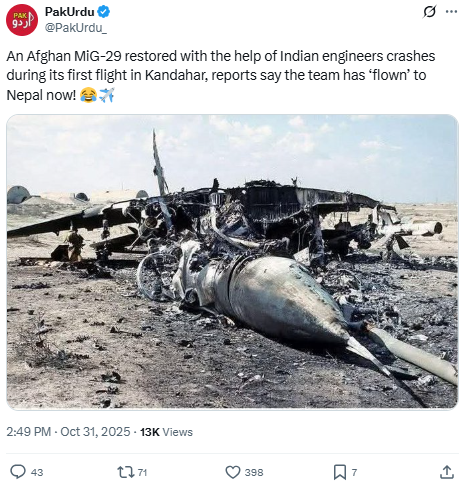 One user, @PakUrdu_, posted it on X with a caption on it that says, “An Afghan MiG-29 restored with the help of Indian engineers crashes during its first flight in Kandahar, reports say the team has ‘flown’ to Nepal now!”