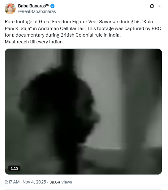 Social media users have shared a video with the caption, “Rare footage of Great Freedom Fighter Veer Savarkar during his ‘Kala Pani Ki Saja” in Andaman Cellular Jail. This footage was captured by the BBC for a documentary during British Colonial rule in India.”