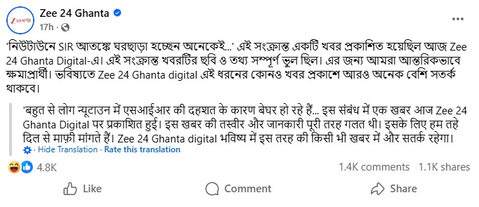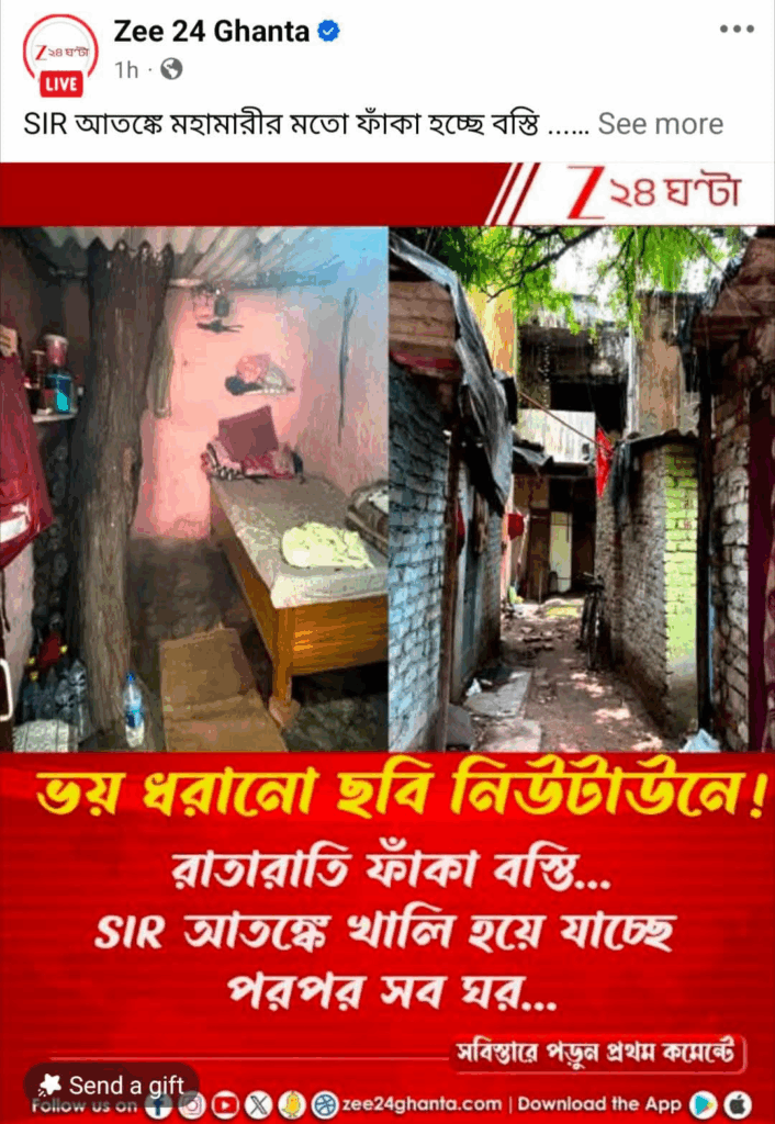 A post claims that slums in New Town, Kolkata, are becoming empty due to panic over “SIR.” Two images were shared along with the post. ZeeNews 24Ghanta shared the post in Bengali. The post wrote,”