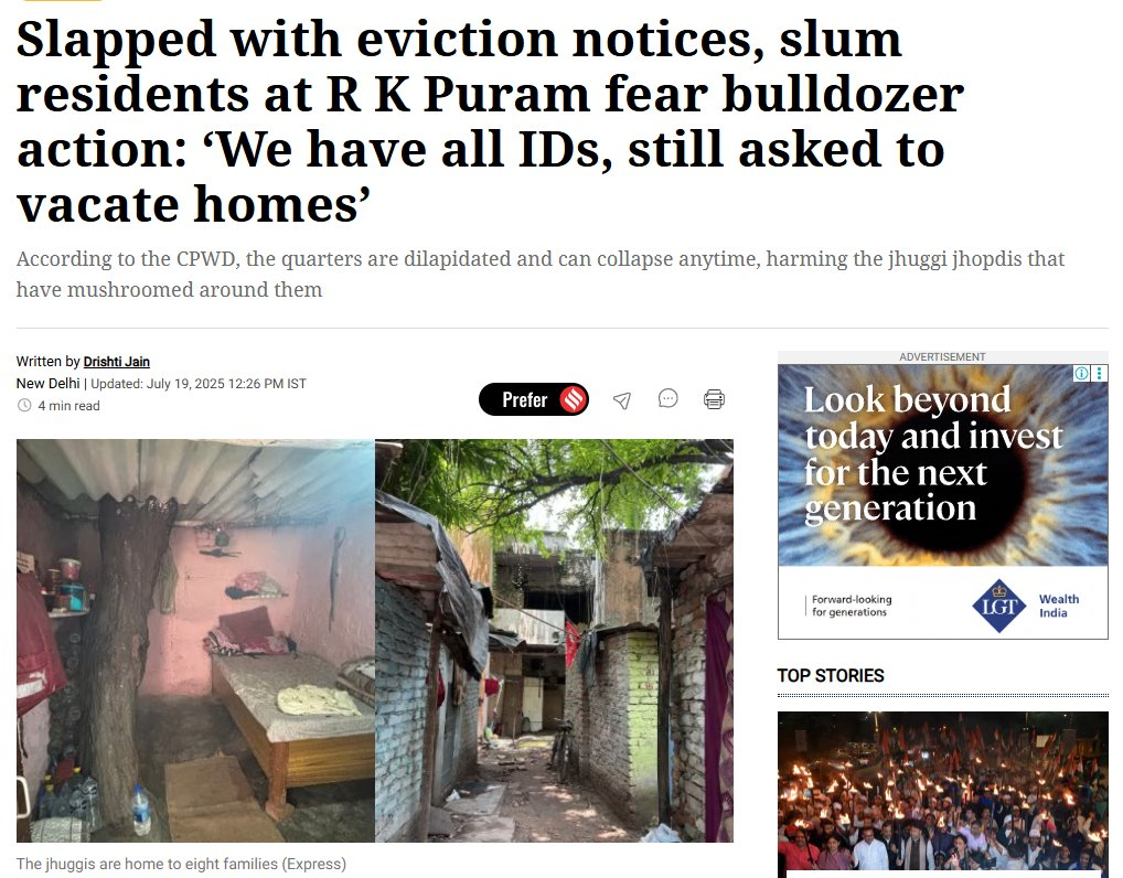 - A reverse image search revealed that the images are not from Kolkata, but from a report published by The Indian Express on July 19, 2025. According to the report, the photographs show women living in unauthorised slums around the Type 1 quarters in RK Puram’s Sector 7 (New Delhi). The Central Public Works Department (CPWD) had issued eviction notices on July 11, instructing residents to vacate within seven days. The CPWD clarified that while the quarters were in a dilapidated state and could collapse at any time, they had not planned any demolition of the jhuggis or quarters.