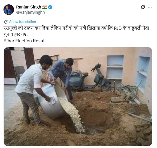 An account named Ranjan Singh shared the claim, stating, “Rasgullas were buried instead of being given to the poor because an RJD strongman lost the election -Bihar Election Result.” (Translated into English)