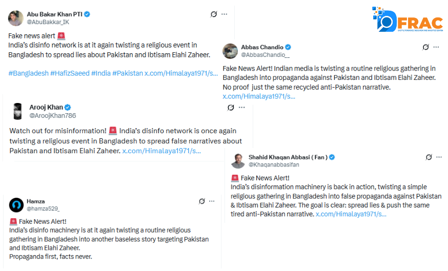 A coordinated disinformation response emerged from Pakistani social media accounts. Multiple users posted identical content claiming “India’s disinfo network is at it again, twisting a religious event in Bangladesh to spread lies about Pakistan and Ibtisam Elahi Zaheer.”