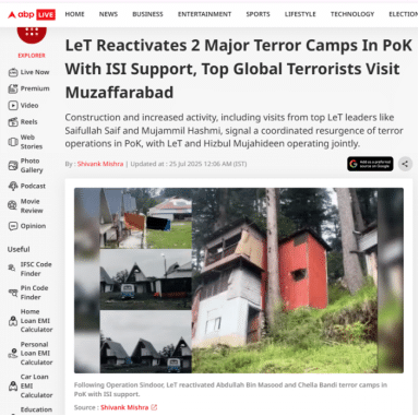 After India’s Operation Sindoor (May 2025) destroyed nine terror camps across Pakistan, Lashkar-e-Taiba chose to resurrect two of its oldest and most notorious facilities. The Abdullah Bin Masood Terror Camp and Chella Bandi Training Camp, both shuttered since India’s 2019 Balakot airstrikes, came back to life in June 2025.