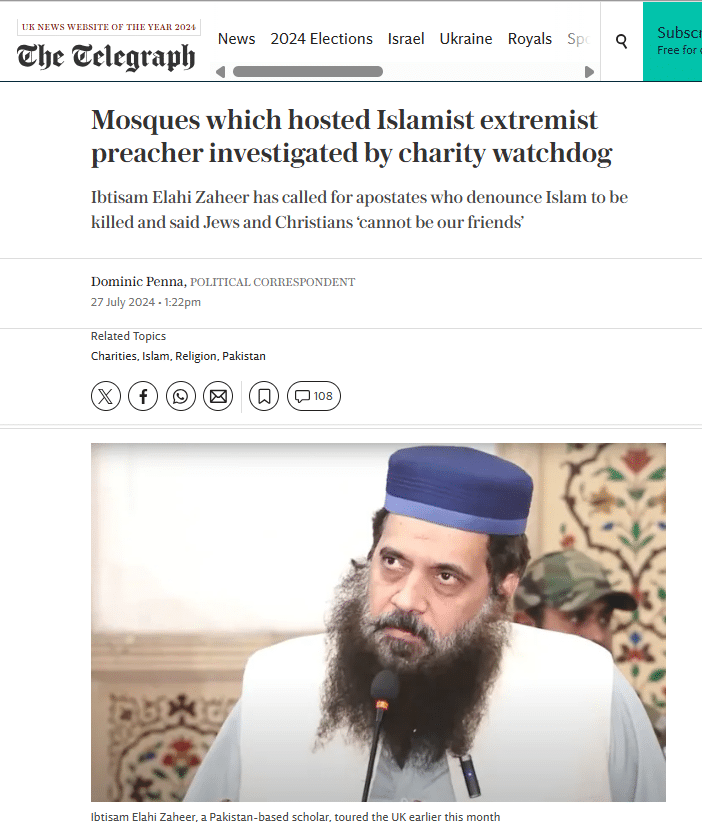 He has long been associated with Hafiz Saeed. His travels to the United Kingdom in 2024 raised such concerns that the British government’s Charity Commission launched investigations into four mosques that had hosted him. His previous statements calling for apostates who denounce Islam to be killed, defending the use of sexual slaves by Muslims, and saying that Jews and Christians “cannot be our friends” had prompted calls from the UK government’s extremism adviser for him to be banned from entering Britain for the sake of public safety.