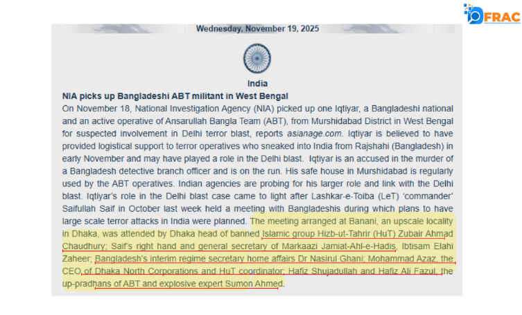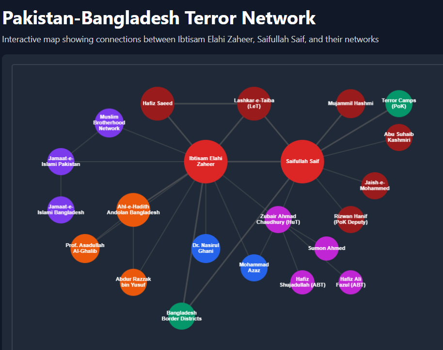 This investigation reveals how Pakistan’s terror organization (Lashkar- e -taiba) is exploiting Bangladesh’s political upheaval to construct what it calls an “eastern front” against India. At the center of this web sits Lashkar-e-Taiba operational commander Saifullah Saif, who publicly declared in October 2025 that LeT operatives are “active in Bangladesh and ready to respond to India.” Working alongside him is Ibtisam Elahi Zaheer, a Pakistani cleric and associate of LeT founder Hafiz Saeed, who has made multiple trips to Bangladesh to forge connections with local extremist networks. Together, they represent a strategy to open a new theater of their operations from the east.