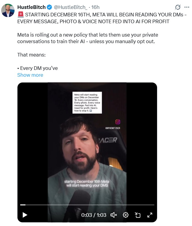 “From December 16, META will start reading your DMs – every message, photo, and voice note will be fed into AI for profit. Meta is introducing a new policy that allows them to use your private conversations to train their AI – unless you opt out yourself. This means: