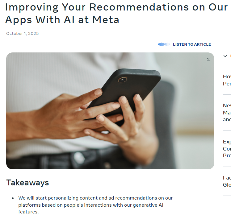 Meta stated: “1- We will begin personalizing content and ad recommendations on our platforms based on people’s conversations with our generative AI features.