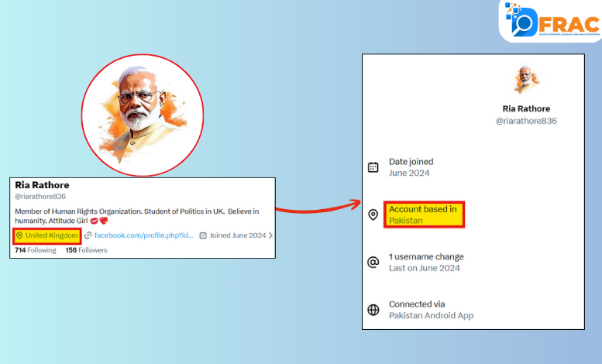 This account uses Prime Minister Modi’s photograph as its profile image and lists the United Kingdom as its location. However, the investigation shows it is also Pakistan-operated.
