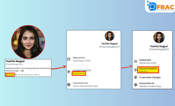 Yashita Nagpal claims to be from Bihar and an “Indian journalist.” But the account is actually operated from Pakistan. Although it currently displays “South Asia,” earlier screenshots clearly show Pakistan as its location.
